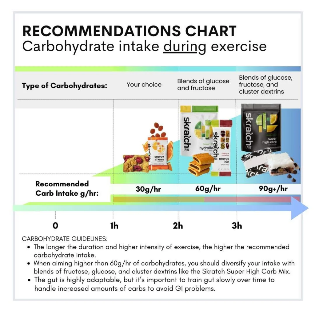 • try and consume approximately 1 gram of carbohydrates per kg of body weight per hour of exercise.